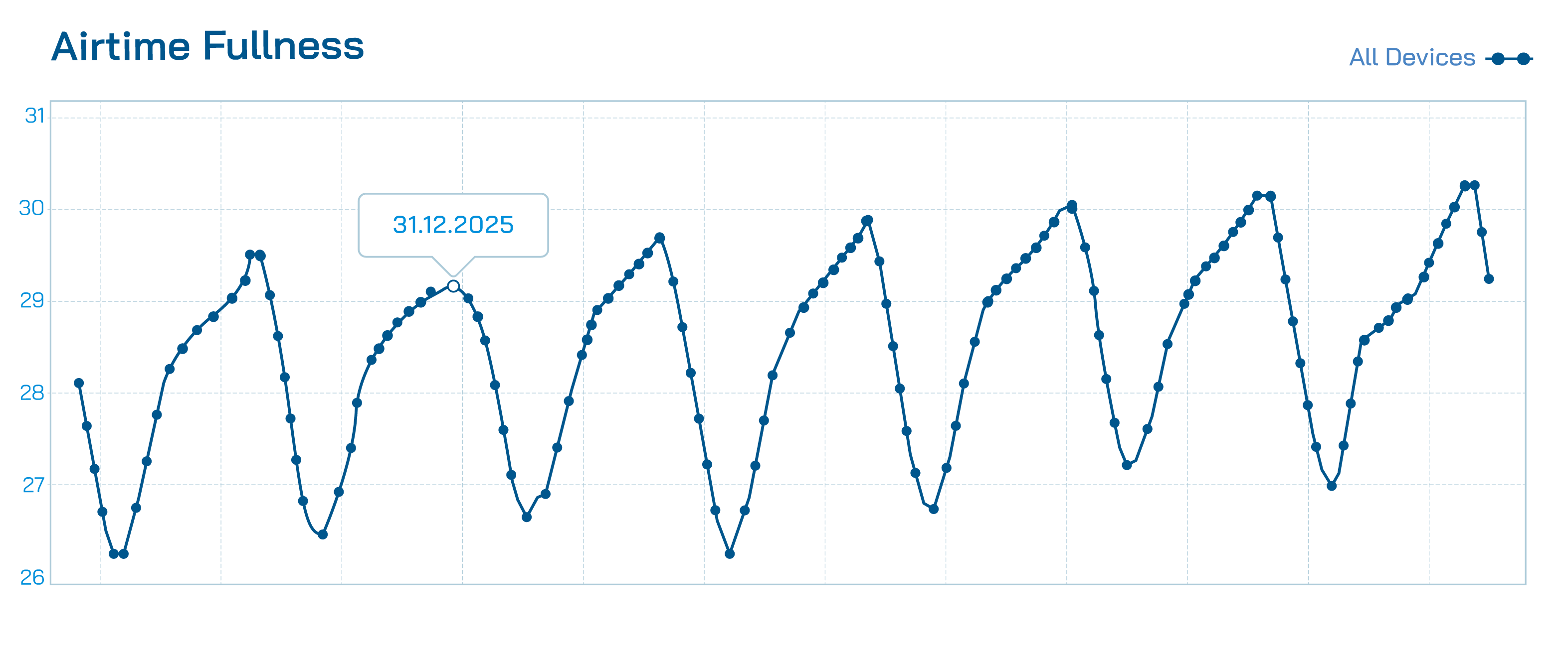 Airtime fullness in home networks on 5 GHz typically peaks around 8–9 PM. Not on New Year’s Eve, though! We observed that airtime fullness didn’t follow its usual pattern and instead stayed relatively stable between 7–10 PM.